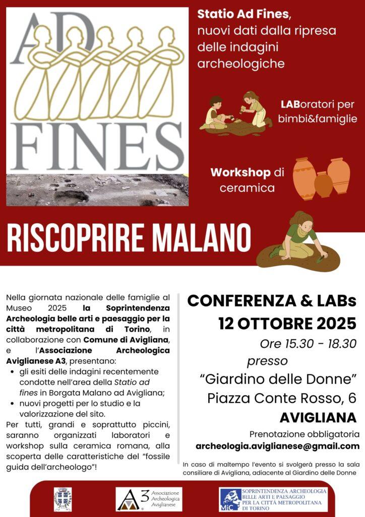 Nella Giornata nazionale delle famiglie al museo 2025, il 12 ottobre dalle 15:30 al Giardino delle Donne di Avigliana la Soprintendenza Archeologia belle arti e paesaggio per la Città metropolitana di Torino, in collaborazione con Comune di Avigliana e l’Associazione Archeologica Aviglianese A3, presentano gli esiti delle indagini recentemente condotte nell’area della Statio ad fines in Borgata Malano ad Avigliana. Saranno inoltre illustrati i nuovi progetti per lo studio e la valorizzazione del sito. La conferenza vedrà il coinvolgimento del personale della Soprintendenza e degli archeologici impegnati nel cantiere di scavo.
