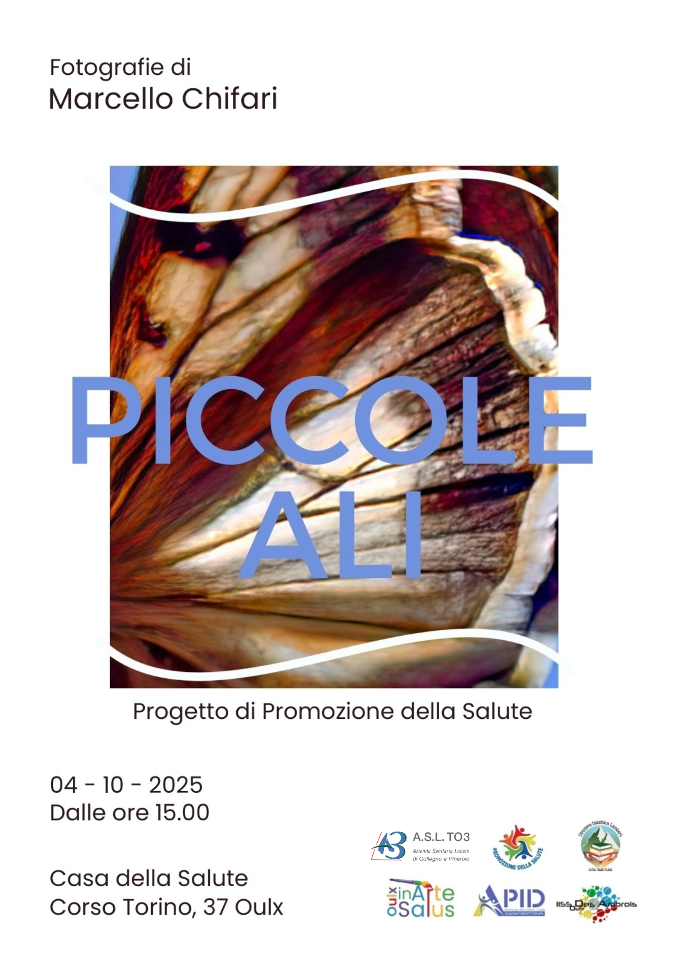 Nell’ambito del progetto di promozione della salute "Oulx in Arte Salus", alla Casa della Salute (corso Torino 37) è allestita la mostra "Piccole Ali", un viaggio visivo tra colori, leggerezza e poesia raccontato attraverso l'obiettivo di Marcello Chifari.