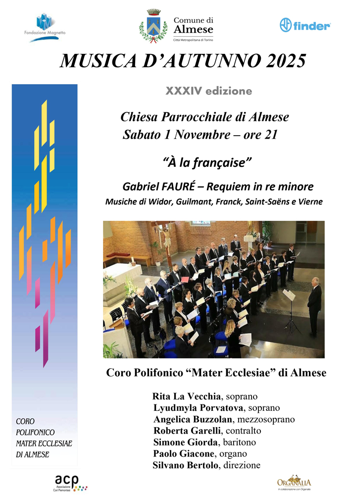 “Musica d’Autunno”si avvale del supporto del Comune di Almese, della Fondazione Magnetto e della Finder, con il patrocinio di Organalia e dell’Associazione Cori Piemontesi.