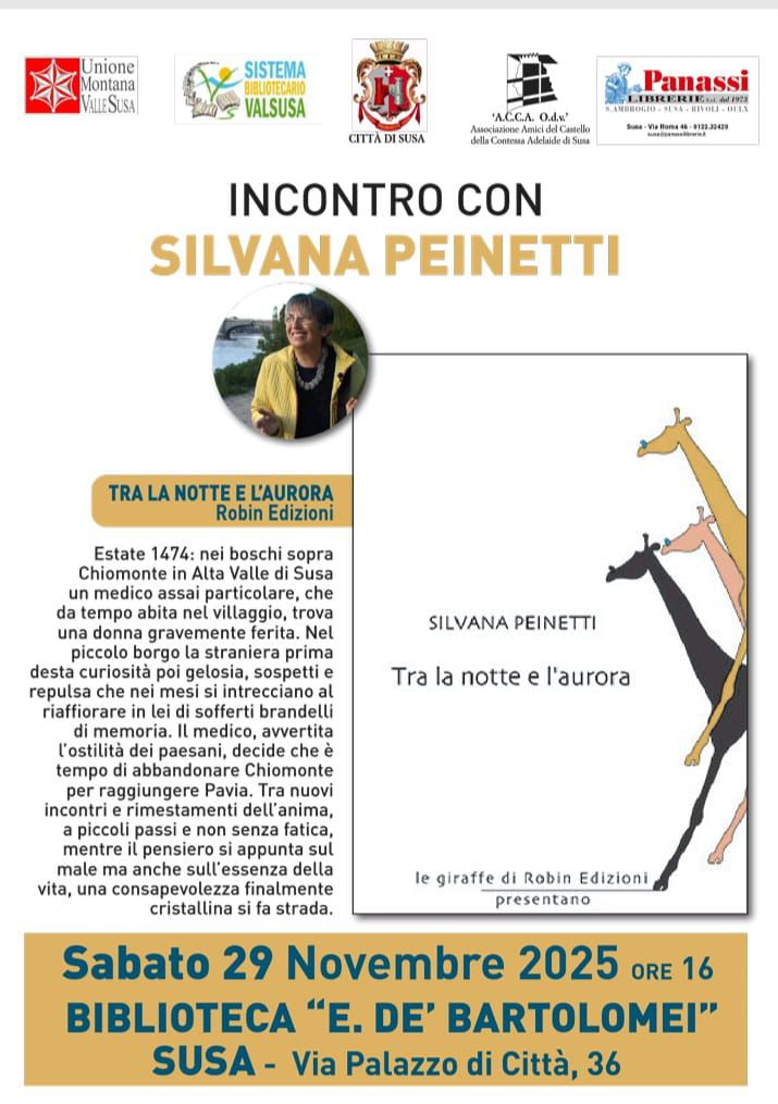 Sabato 29 novembre alle ore 16:00 nella biblioteca civica "E. De' Bartolomei" (via Palazzo di Città 36) a Susa incontro con Silvana Peinetti, autrice del libro "Tra La Notte e l'Aurora".