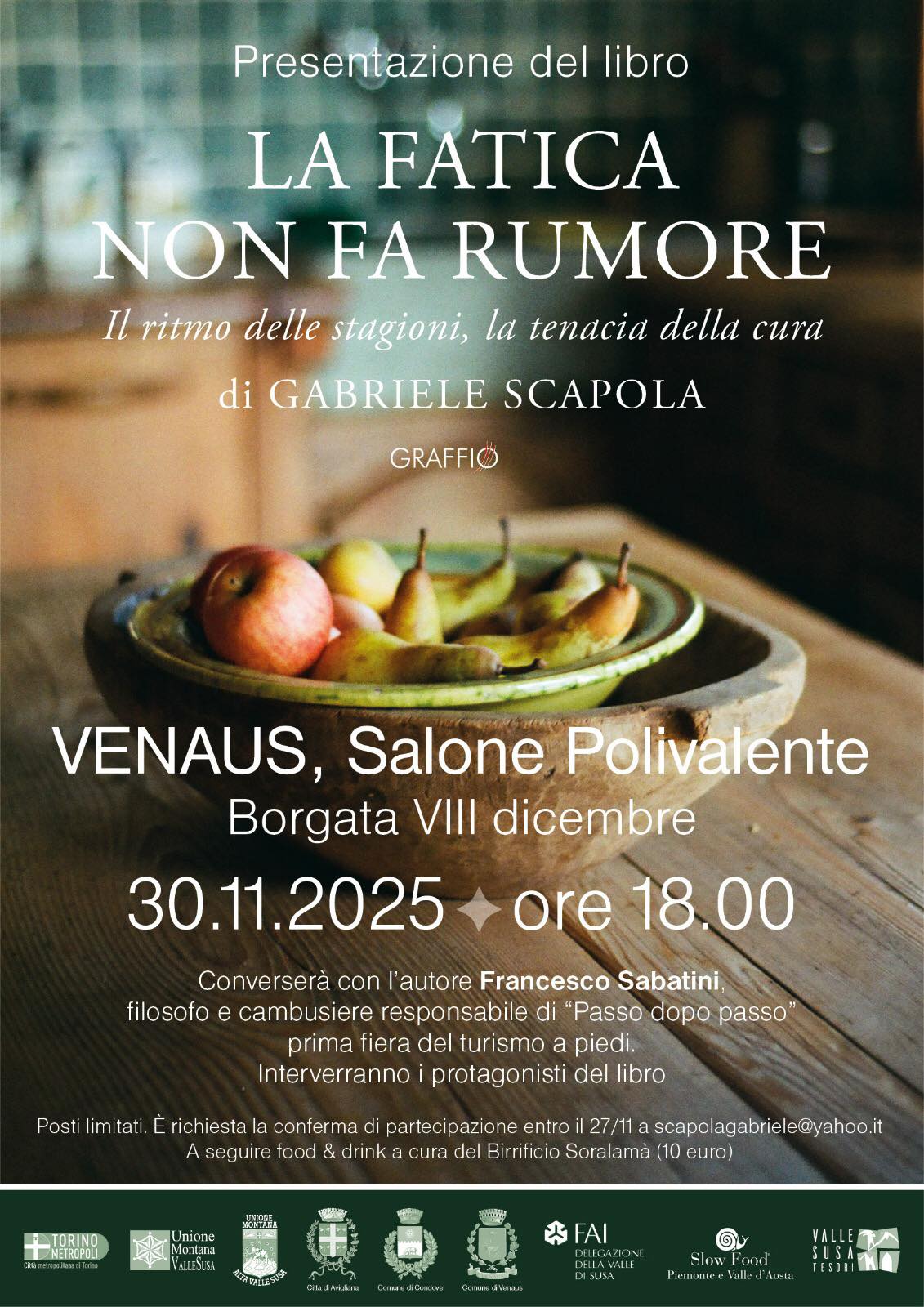 Domenica 30 novembre alle ore 18 nel salone in Borgata VIII dicembre a Venaus presentazione del libro “La fatica non fa rumore” di Gabriele Scapola, un libro fotografico sulla Val Susa; 16 storie divise su 4 stagioni per raccontare la vita e le scelte di uomini e donne straordinari.