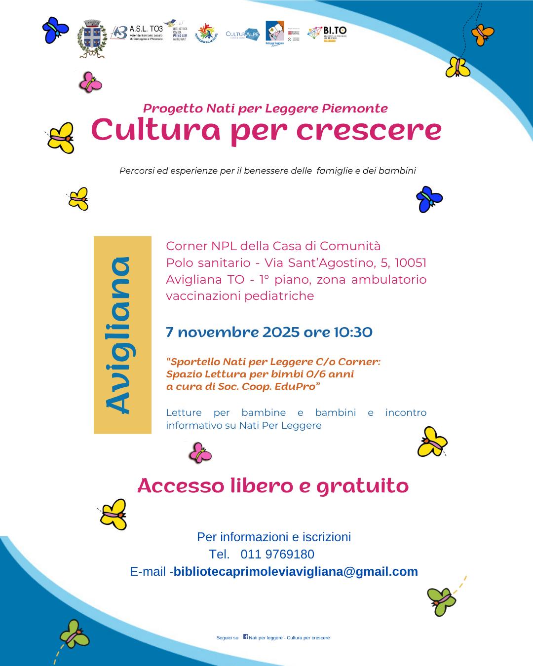 Venerdì 7 novembre alle ore 10:30 al Corner NPL della Casa di Comunità (Polo sanitario, Via Sant’Agostino 5, Avigliana – 1º piano, zona ambulatorio vaccinazioni pediatriche) Spazio Lettura per bimbi 0/6 anni e incontro informativo su Nati per Leggere, a cura della Soc. Coop. EduPro.