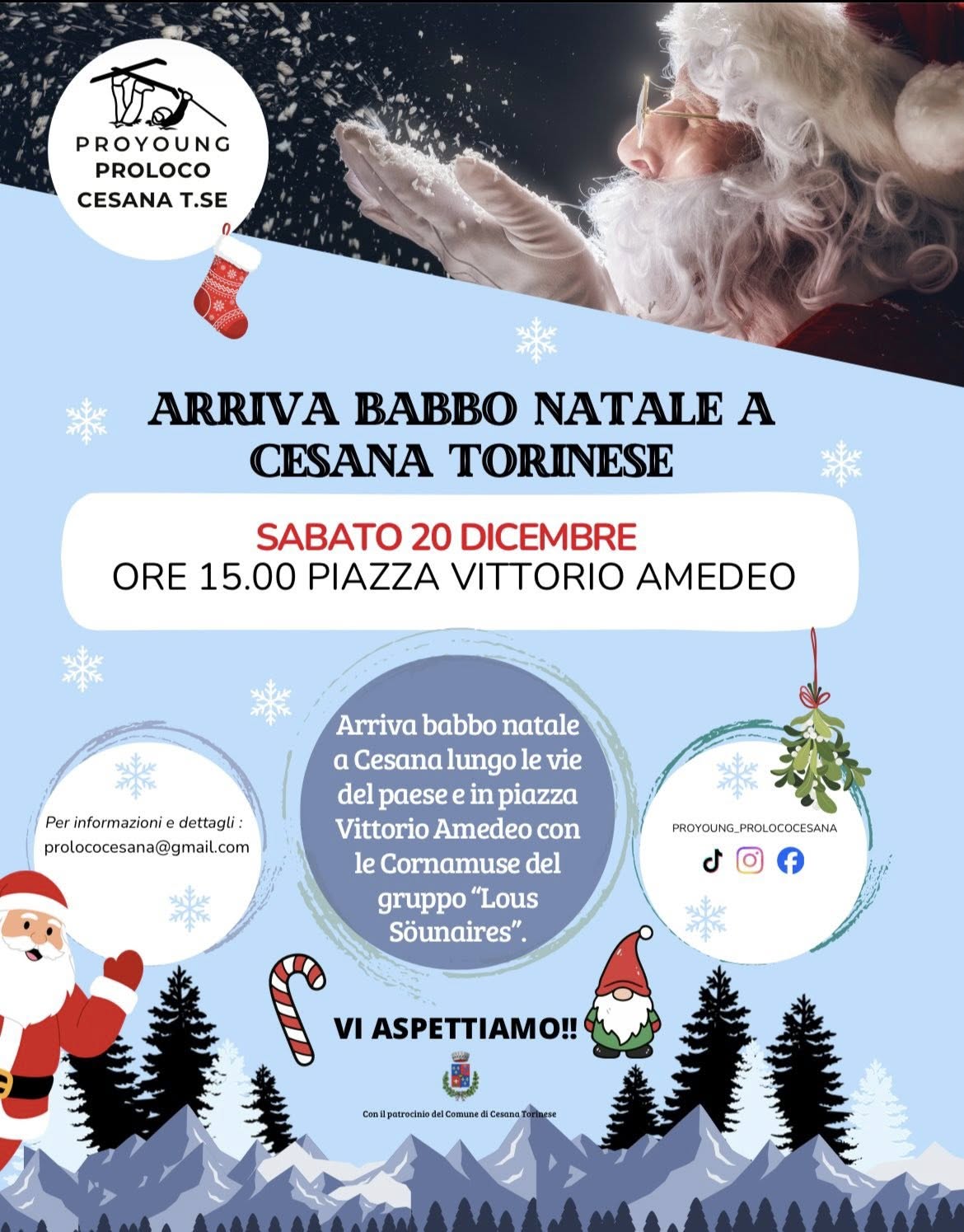 Sabato 20 dicembre BABBO NATALE A CESANA E LE CORNAMUSE DEL GRUPPO “LOUS SOUNAIRES” alle ore 15 lungo le vie del paese e in Piazza Vittorio Amedeo.