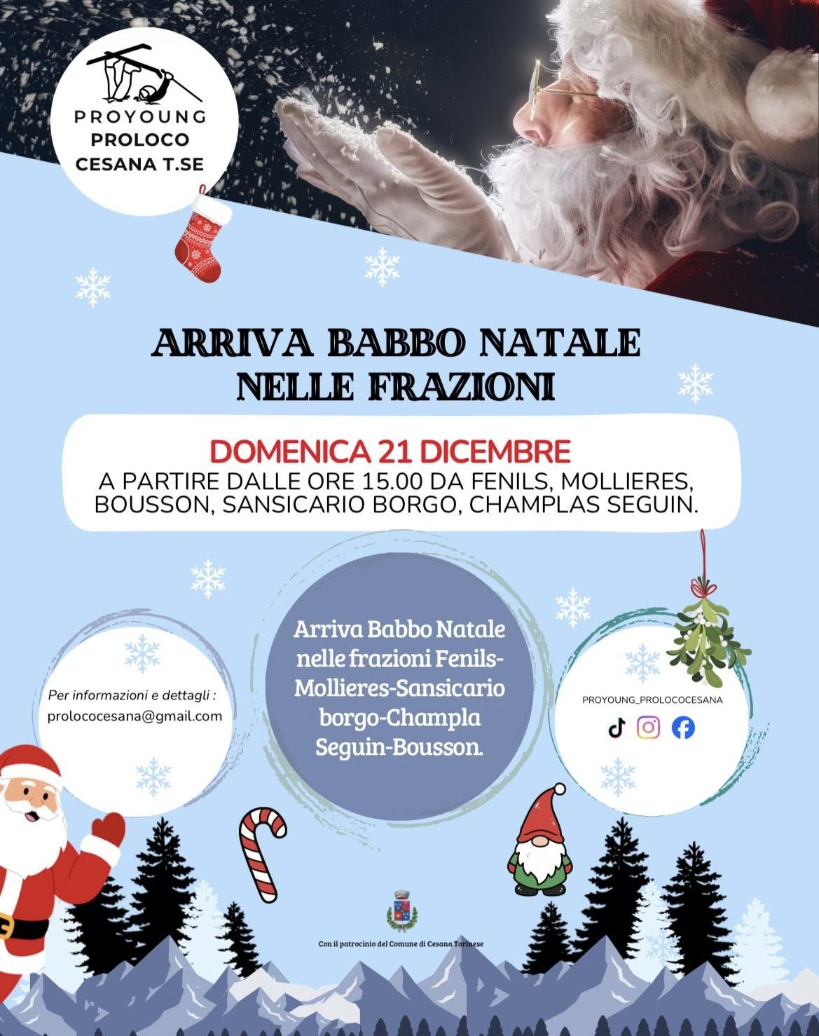 Domenica 21 dicembre BABBO NATALE NELLE FRAZIONI. Dalle ore 15 nelle frazioni: Fenils, Mollières, Sansicario Borgo, Champlas Seguin, Bousson, Thures.