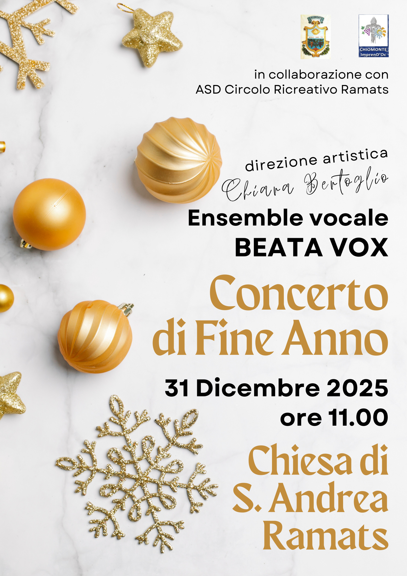 Mercoledì 31 dicembre alle ore 11 nella cappella di Sant'Andrea in frazione Ramats "Concerto di fine Anno" dell'Ensemble vocale "Beata vox" - direzione artistica di Chiara Bertoglio.