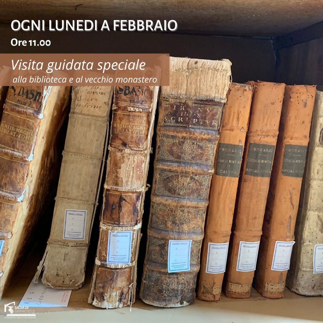 A febbraio si tengono nuovamente le visite guidate speciali della Sacra, ogni lunedì alle ore 11: oltre al percorso classico si può visitare la biblioteca, il piano nobile e le aree museali del vecchio monastero, solitamente chiuse al pubblico.