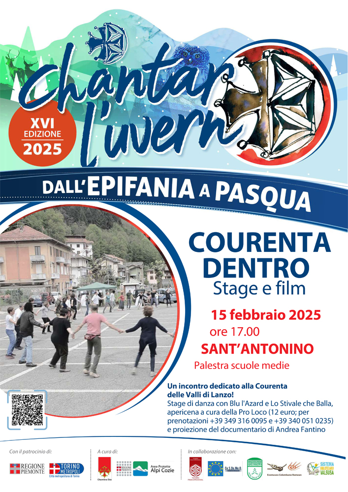 Sabato 15 febbraio a Sant'Antonino di Susa nella palestra delle scuole medie, ore 17 stage di Courente delle Valli di Lanzo con musica dal vivo, ed esperti di etnomusicologia ed etnocoreutica. Alle ore 21 proiezione del documentario di Andrea Fantino Courenta dentro, per approfondire il discorso delle musiche e delle danze tradizionali in Valli di Lanzo. Il documentario di Andrea Fantino è prodotto da Chambra d’Oc. Con la partecipazione di Silvano Balla, Roberta Bertolotti Bianc, Gianni Castagneri, Carla Cavatore, Barbara Giacchero, Giorgio Giors Reviglio, Carlo Marietta, Giusy Negro, Marino Poma, Blu l’azard, CoroMoro.