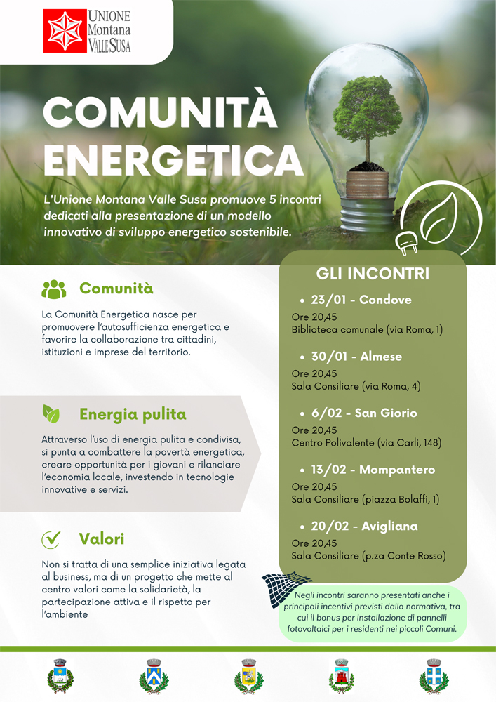 L’Unione Montana Valle Susa, in collaborazione con la Comunità Energetica Rinnovabile ETS “Energia Comune”, organizza una serie di incontri dedicati alla presentazione di un modello innovativo di sviluppo energetico sostenibile.