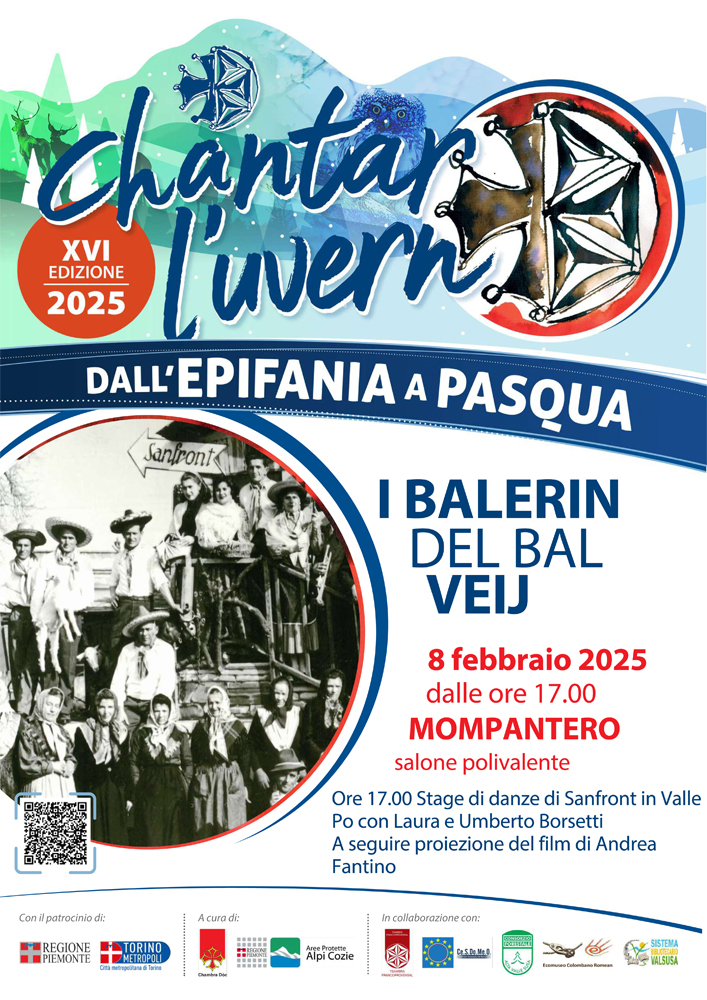 Sabato 8 febbraio a Mompantero, nel salone polivalente, ore 17 uno stage dedicato alla danze di San Front in Valle Po, animato dall'Associazione I Balerin del bal veij.