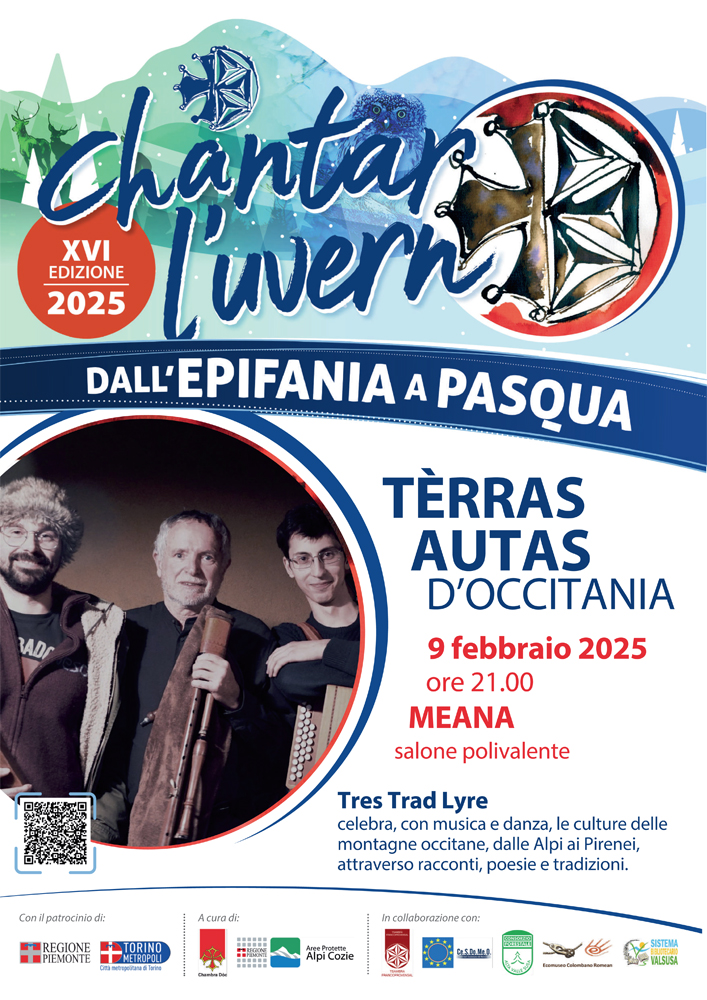 Domenica 9 febbraio ore 21 a Meana di Susa nel salone polivalente, Tèrras autas d'Occitania, spettacolo musicale del gruppo Tres Trad Lyre.