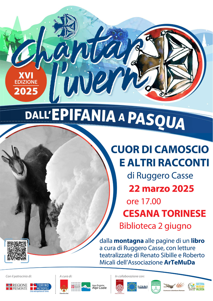 Sabato 22 marzo a Cesana Torinese, alle ore 17, in biblioteca, in viale 4 novembre 11, presentazione del libro di Ruggero Casse Cuor di camoscio e altri racconti, storie di montagna dell'Alta Val di Susa (Editrice Tipografia Baima-Ronchetti).
