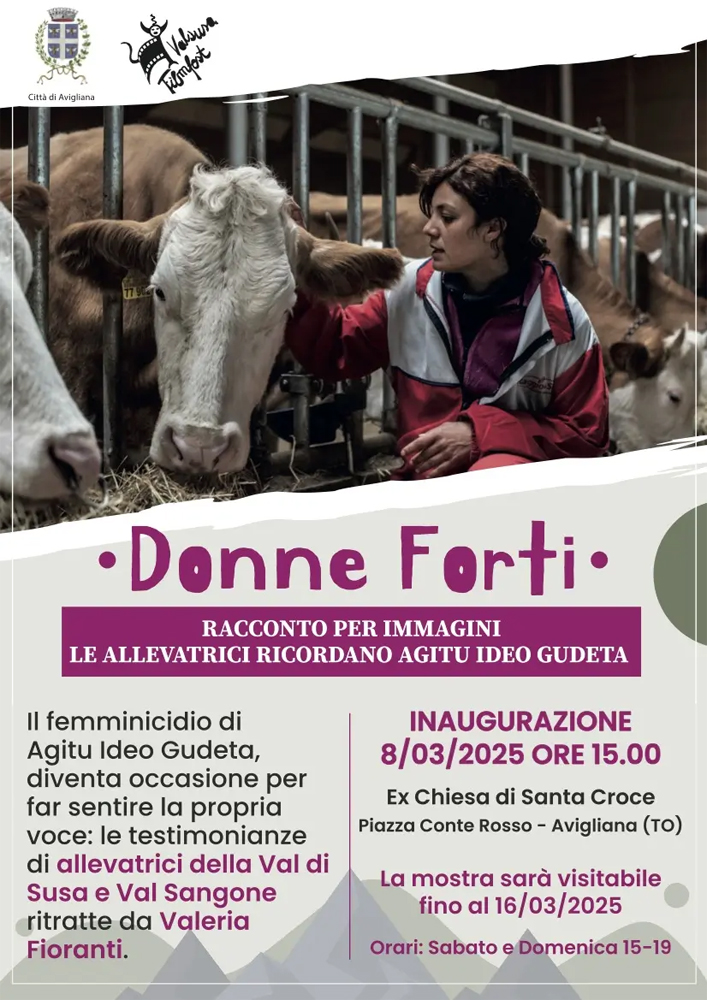L’esposizione si può visitare fino al 16 marzo il sabato e la domenica dalle 15 alle 19 nella chiesa di Santa Croce. Sono esposti i ritratti di 25 allevatrici (tra Val di Susa e Val Sangone). La mostra prende spunto dal femminicidio avvenuto il 29 dicembre 2020 di Agitu Ideo Gudeta, l’imprenditrice agricola etiope immigrata in Italia, in Trentino, dove aveva fondato l’azienda “La capra felice”. Il titolo della mostra si ispira all’iniziativa di Marzia Verona, scrittrice e allevatrice valdostana che nei giorni successivi all’uccisione dell’allevatrice lanciò l’hashtag #donneforti e pubblicò un post sul suo blog che raccolse immediatamente moltissime adesioni da donne agricoltrici/allevatrici di tutta Italia.