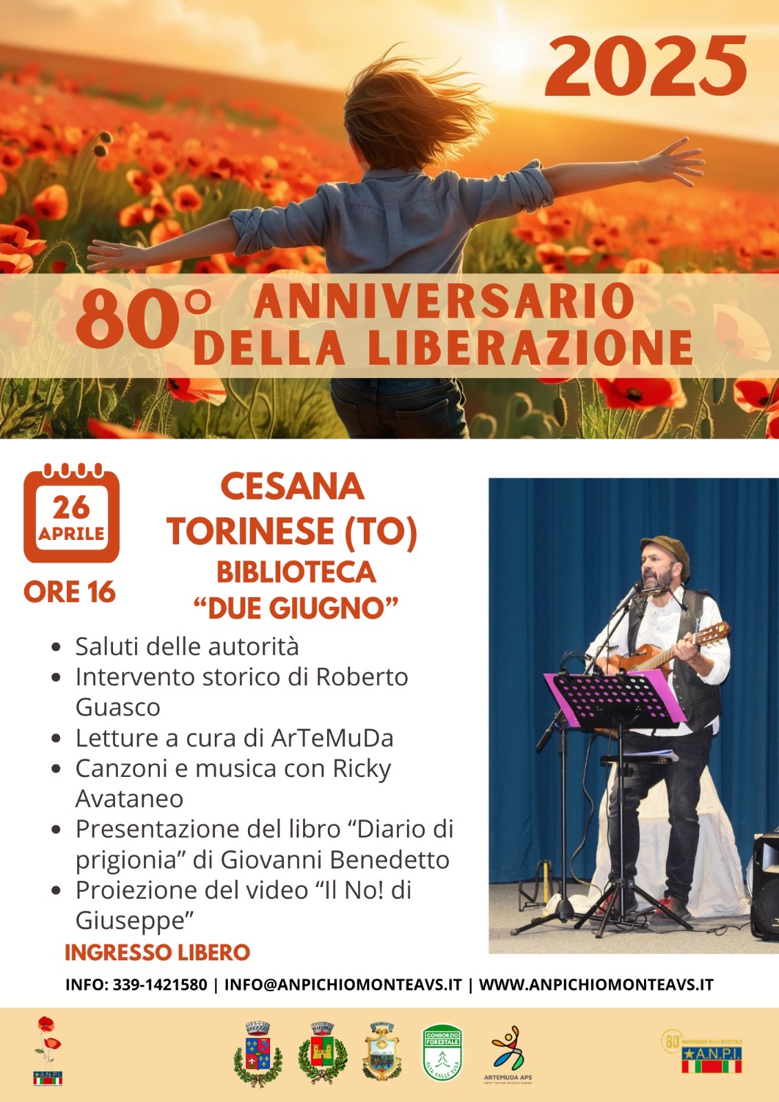 Letture in ricordo della Liberazione a cura dell’associazione ArTeMuDa. Parteciperà una rappresentanza dei “Maquis de l’Oisans” di Pont de Claix. Interverrà la Banda Musicale Alta Valle Susa - Sabato 26 aprile alle 16 a Cesana Torinese a cura di ANPI, con il patrocinio del Comune, saluti delle autorità, intervento storico di Roberto Guasco, letture a cura di ArTeMuDa, canzoni e musica con Ricky Avataneo, presentazione del libro Diario di prigionia di Giovanni Benedetto, proiezione del video Il No! di Giuseppe.