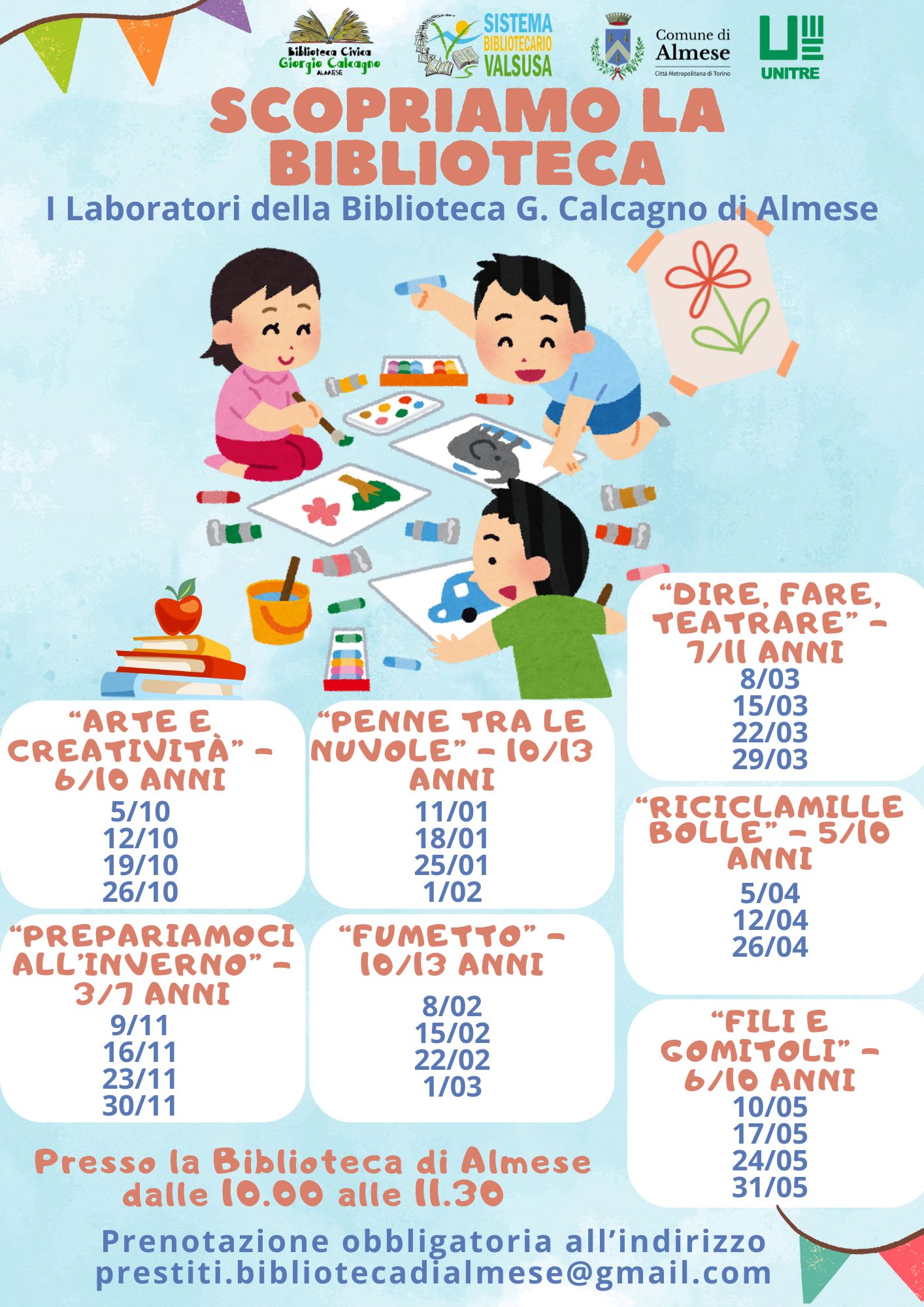 I laboratori si terranno ogni sabato mattina, dalle ore 10:00 alle 11:30, alla Biblioteca Civica di Almese (Via Roma 4).