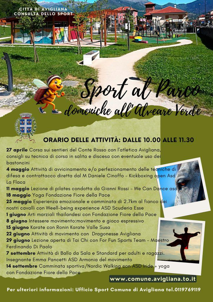 Dal 27 aprile tutte le domeniche mattina dalle 10 al parco Alveare verde di Avigliana, all’altezza di corso Laghi 100, si svolgerà Sport al parco, un ciclo di lezioni e incontri gratuiti aperti a tutti, per la promozione dell’attività sportiva, con punto di incontro sotto la tettoia dell’Alveare verde.