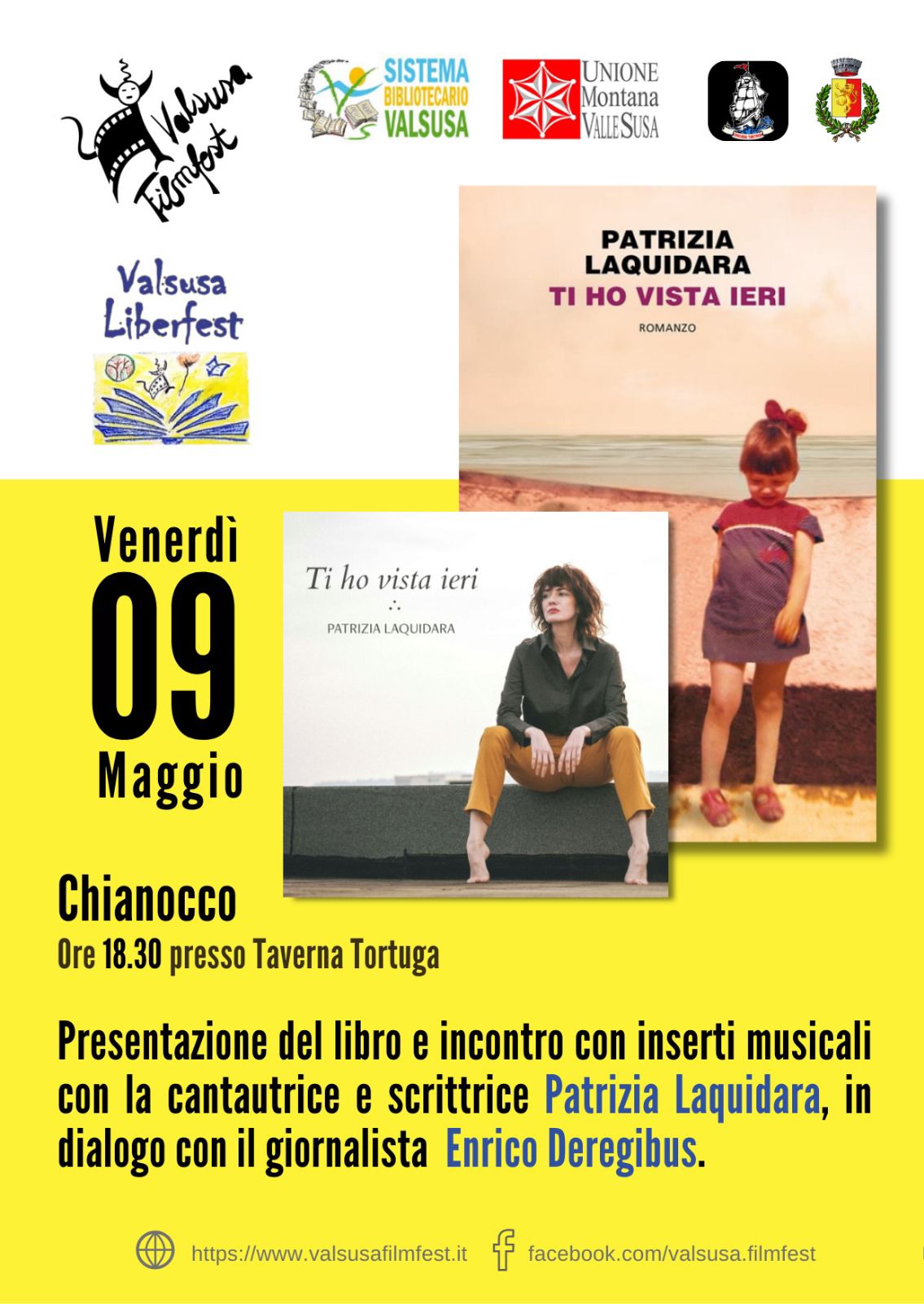 Venerdì 9 maggio, alle ore 18:30 alla Taverna Tortuga di Chianocco ad ingresso libero, Patrizia Laquidara dialogherà con Enrico Deregibus attorno al suo romanzo “Ti ho vista ieri” (Neri Pozza Editore) con alcuni inserti musicali. Il libro è il racconto di un’infanzia della fine degli anni Settanta, quando una piccola vettura gialla stracolma di bagagli poteva scivolare su e giù per la penisola, dalla Sicilia al Veneto.