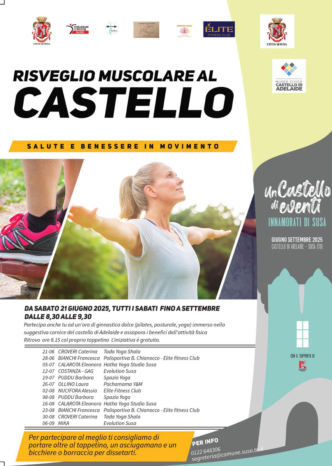 Da sabato 21 giugno torna l’appuntamento con il “Risveglio Muscolare al Castello”, iniziativa, organizzata dall’amministrazione comunale, che prevede un’ora di ginnastica dolce a settimana, gratuita, con i migliori istruttori del territorio.
