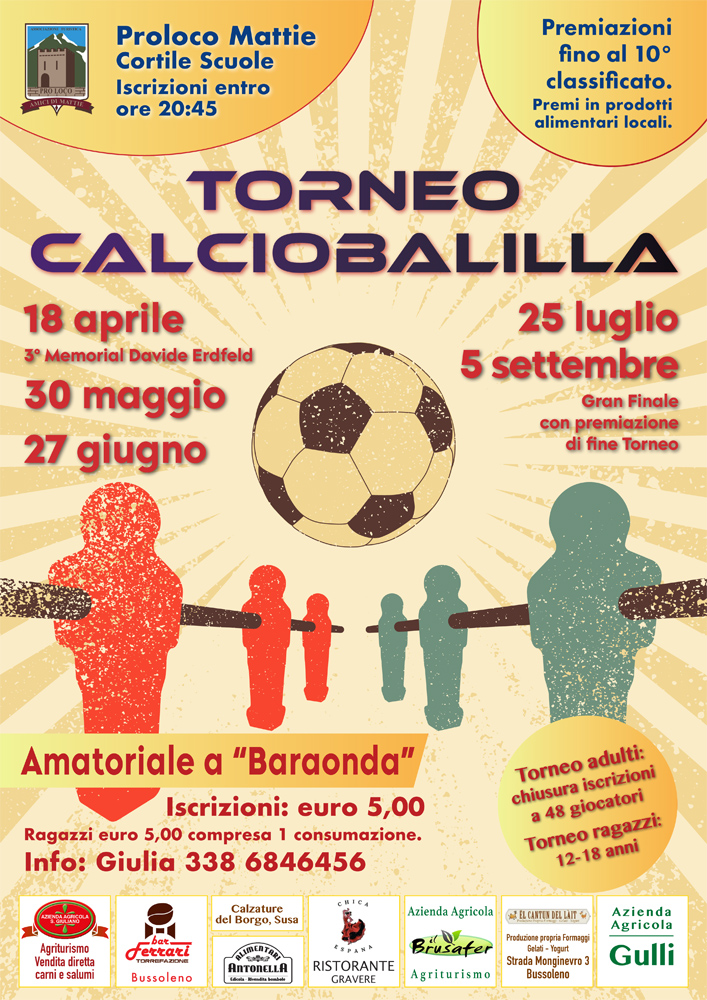 Torneo di calciobalilla amatoriale a baraonda nel cortile delle scuole. Iscrizioni entro le 20:45.