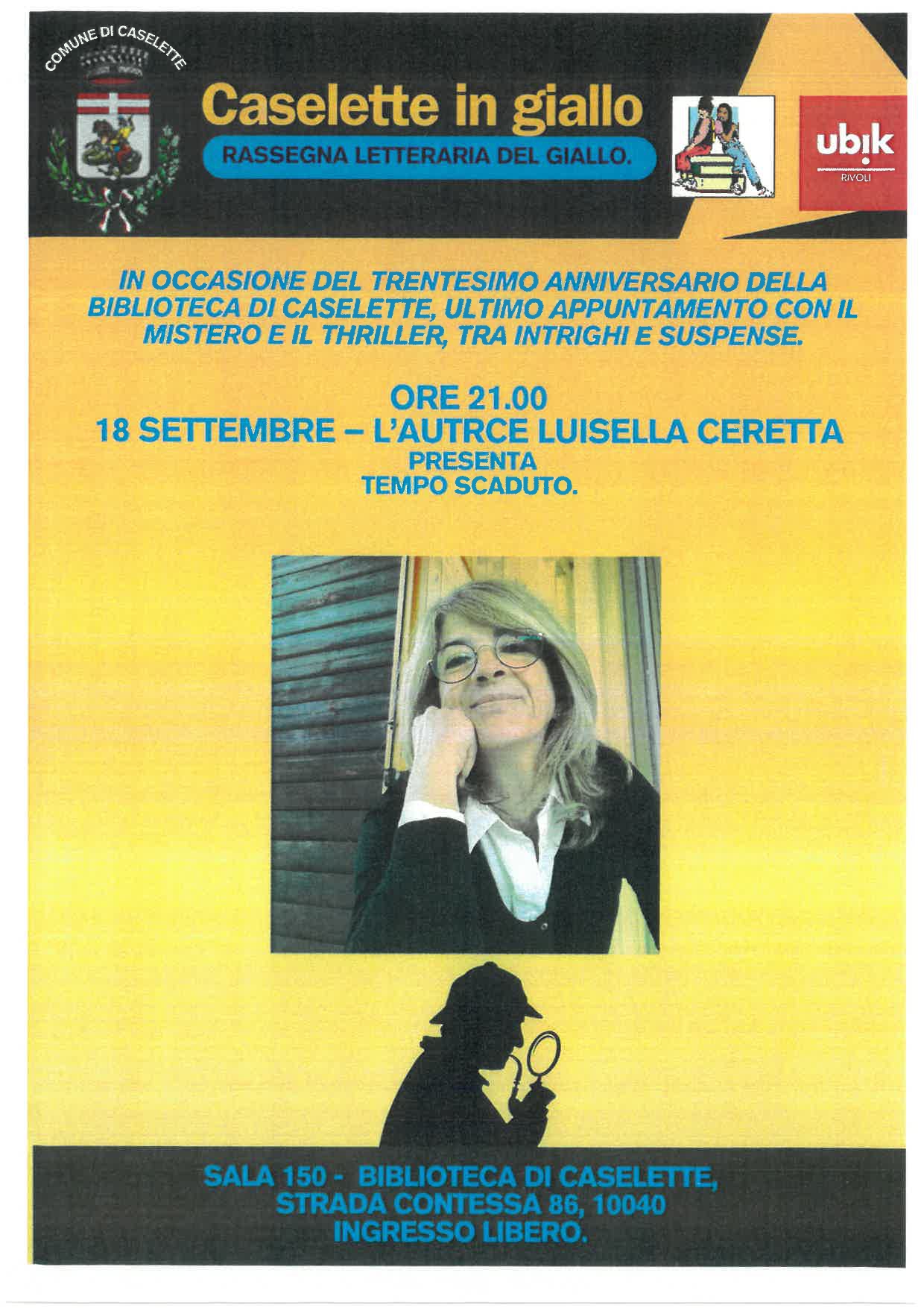 Giovedì 18 settembre alle ore 21 nella Sala 150 - Biblioteca di Caselette l'autrice Luisella Ceretta presenta il libro ''Tempo scaduto''.