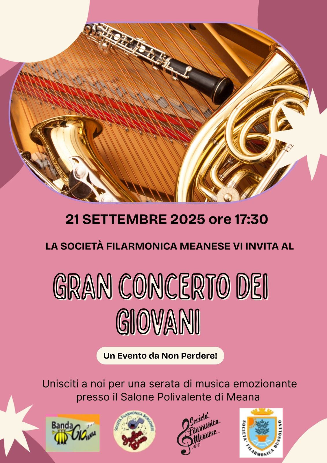Domenica 21 settembre, dopo il tradizionale ballo dei branc, la Filarmonica Meanese accompagnerà al salone polivalente dove alle 17:30 i giovani delle bande musicali di Meana, Bussoleno, Borgone e Sant'Antonino, riuniti in un unico complesso musicale, terranno il loro gran concerto.