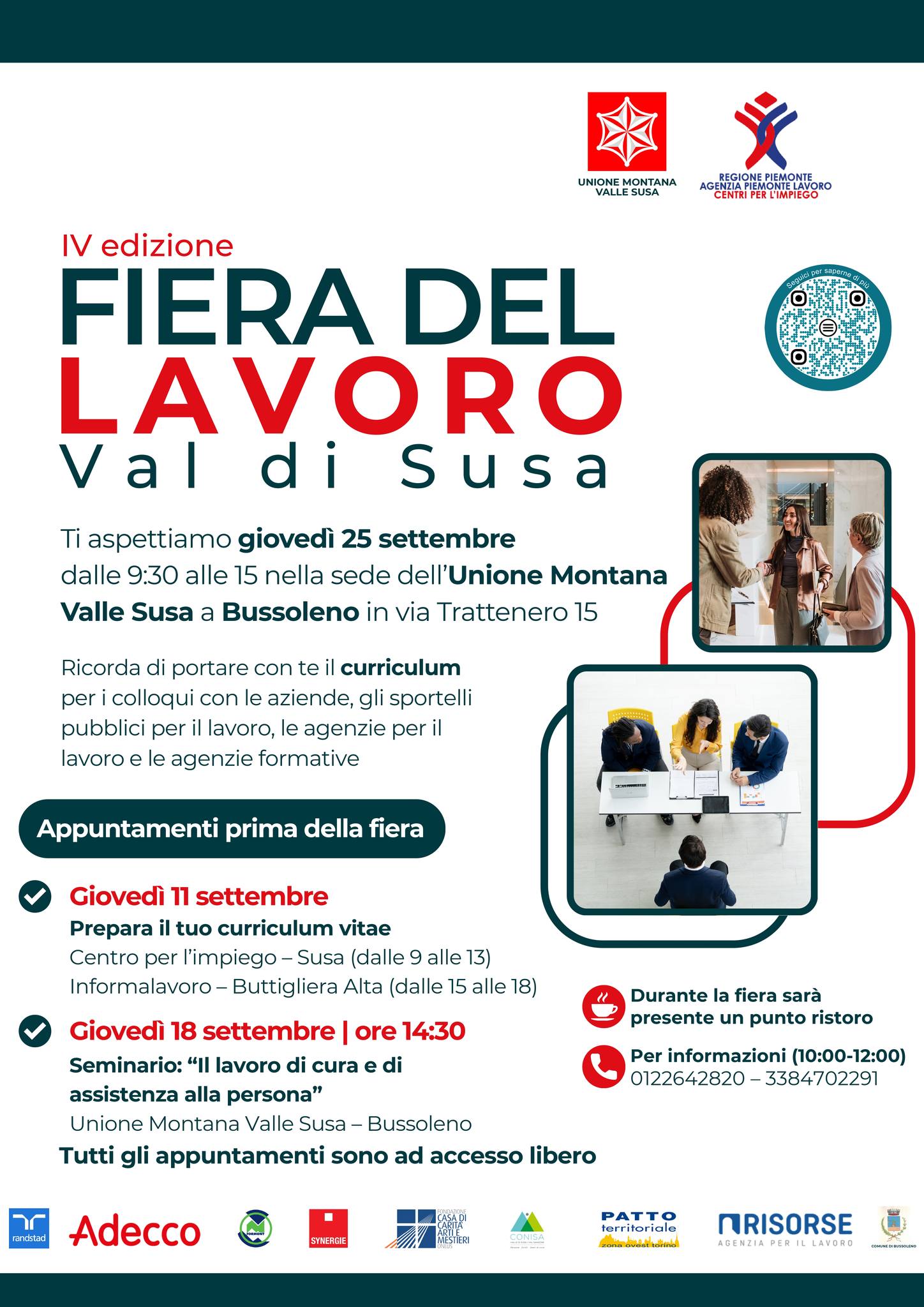 A conferma del successo delle precedenti edizioni, torna l’appuntamento annuale con la Fiera del Lavoro Val di Susa. L’iniziativa, organizzata dall’Unione Montana Valle Susa in collaborazione con Agenzia Piemonte Lavoro – Centro per l’impiego di Susa, si svolgerà giovedì 25 settembre nella sede dell’Unione Montana Valle Susa in via Trattenero 15.