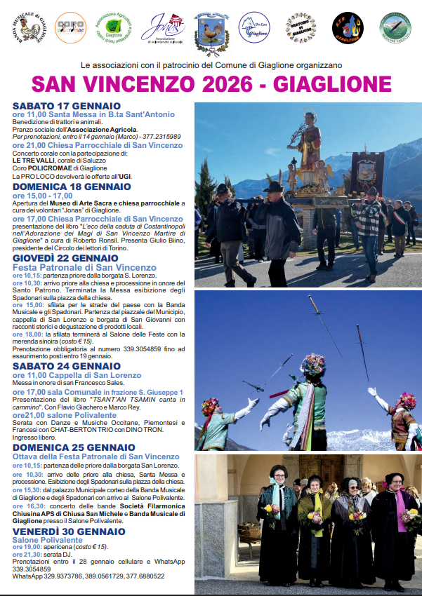 ore 15,30 Dal piazzale municipale corteo della Banda Musicale di Giaglione e degli Spadonari con arrivo al Salone Polivalente