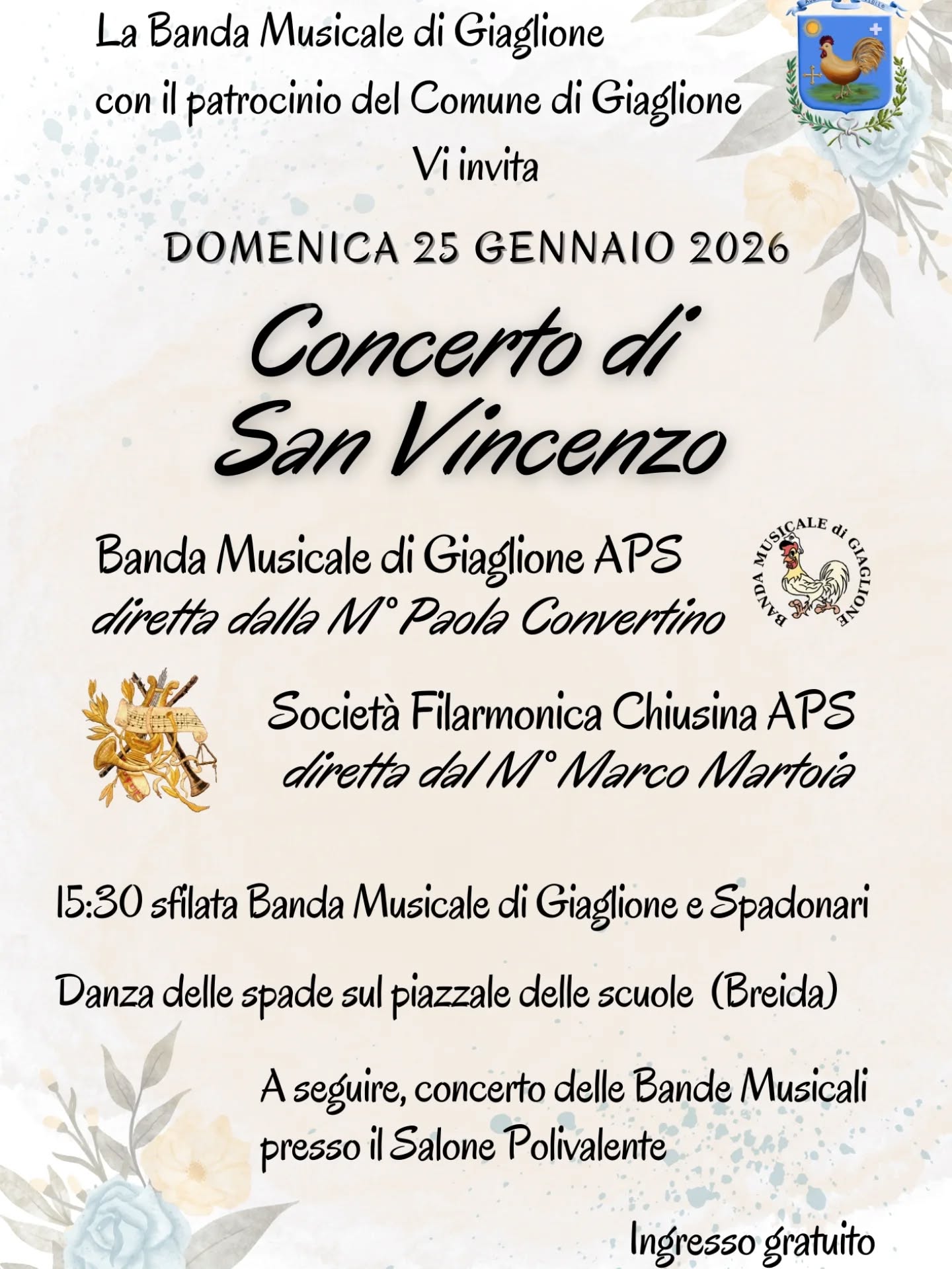 ore 16,30 Concerto delle bande Sociali Filarmonica Chiusa APS di Chiusa San Michele e Banda Musicale di Giaglione nel Salone Polivalente -