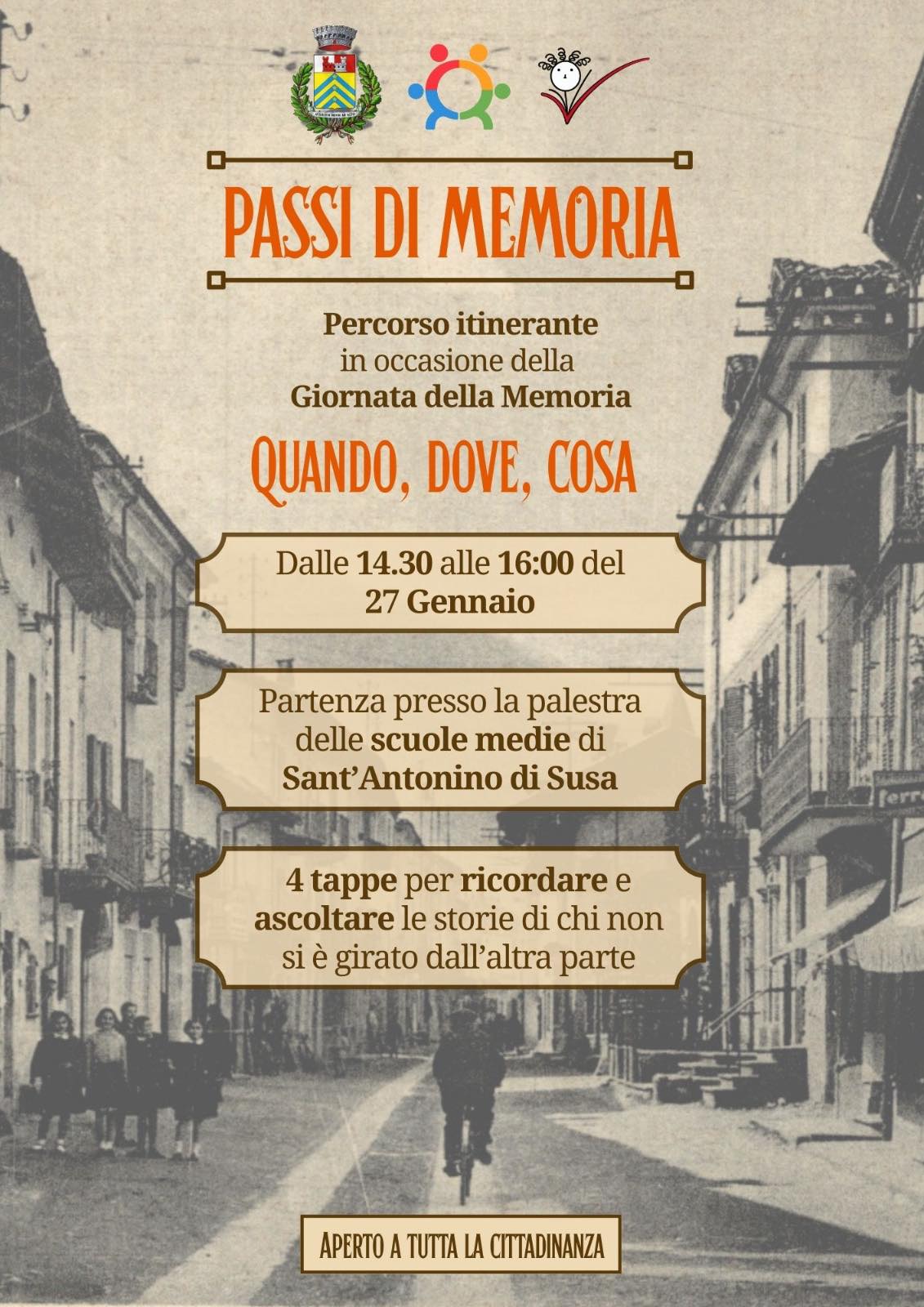 In occasione della Giornata della Memoria, il Comune di Sant’Antonino di Susa invita a partecipare a “Passi di Memoria”, un percorso itinerante pensato per fermarsi, ascoltare e riflettere.