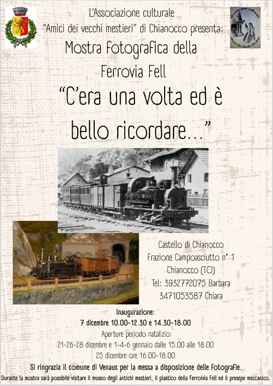 L'associazione culturale "Amici dei vecchi mestieri" di Chianocco presenta la mostra fotografica della Ferrovia Fell "C'era una volta ed è bello ricordare..." al Castello di Chianocco - Frazione Camposciutto 1.