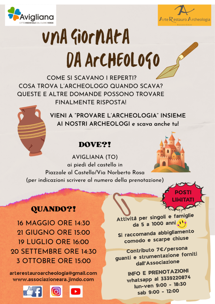 L’associazione Ara, Arte, restauro, archeologia apre la nuova area verde ai piedi del Castello di Avigliana, sotto al piazzale al Castello in via Norberto Rosa, che ospita il sito archeologico simulato. L’iniziativa ha ottenuto il patrocinio del Comune di Avigliana e prevede 5 date aperte al pubblico: sabato 16 maggio alle 14,30, domenica 21 giugno alle 15, domenica 19 luglio alle 16, domenica 20 settembre alle 14,30, sabato 3 ottobre alle 15.