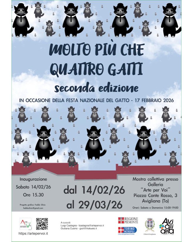 In occasione della Festa nazionale del gatto il 17 febbraio, torna alla Galleria Arte per Voi di piazza Conte Rosso, 3 la collettiva su arte e felini "Molto più che quattro gatti (seconda edizione)".