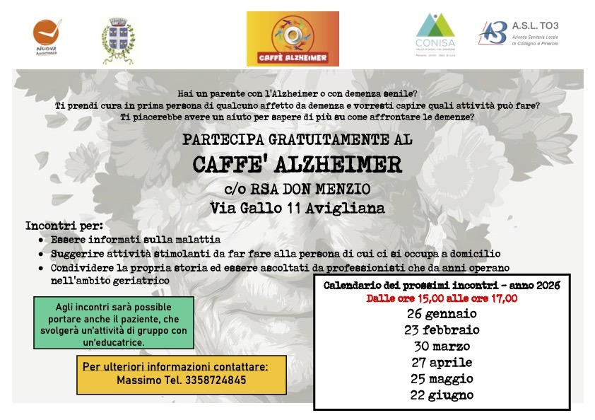 Dalle 15 alle 17 incontri mensili gratuiti del Caffè Alzheimer, destinati ai caregiver di persone affette da demenza senile e morbo di Alzheimer. Gli incontri, per essere informati sulla malattia, suggerire attività stimolanti da far fare alla persona di cui ci si occupa a domicilio, condividere la propria storia ed essere ascoltati da professionisti che da anni operano nell’ambito geriatrico, si tengono all’Rsa Don Menzio in via Gallo 11 ad Avigliana. Il ciclo di appuntamenti è promosso dall’assessorato alla Sanità e con il patrocinio del Comune di Avigliana in collaborazione con Nuova assistenza cooperativa sociale onlus, consorzio Conisa Valle Di Susa – Valsangone e AslTo3.