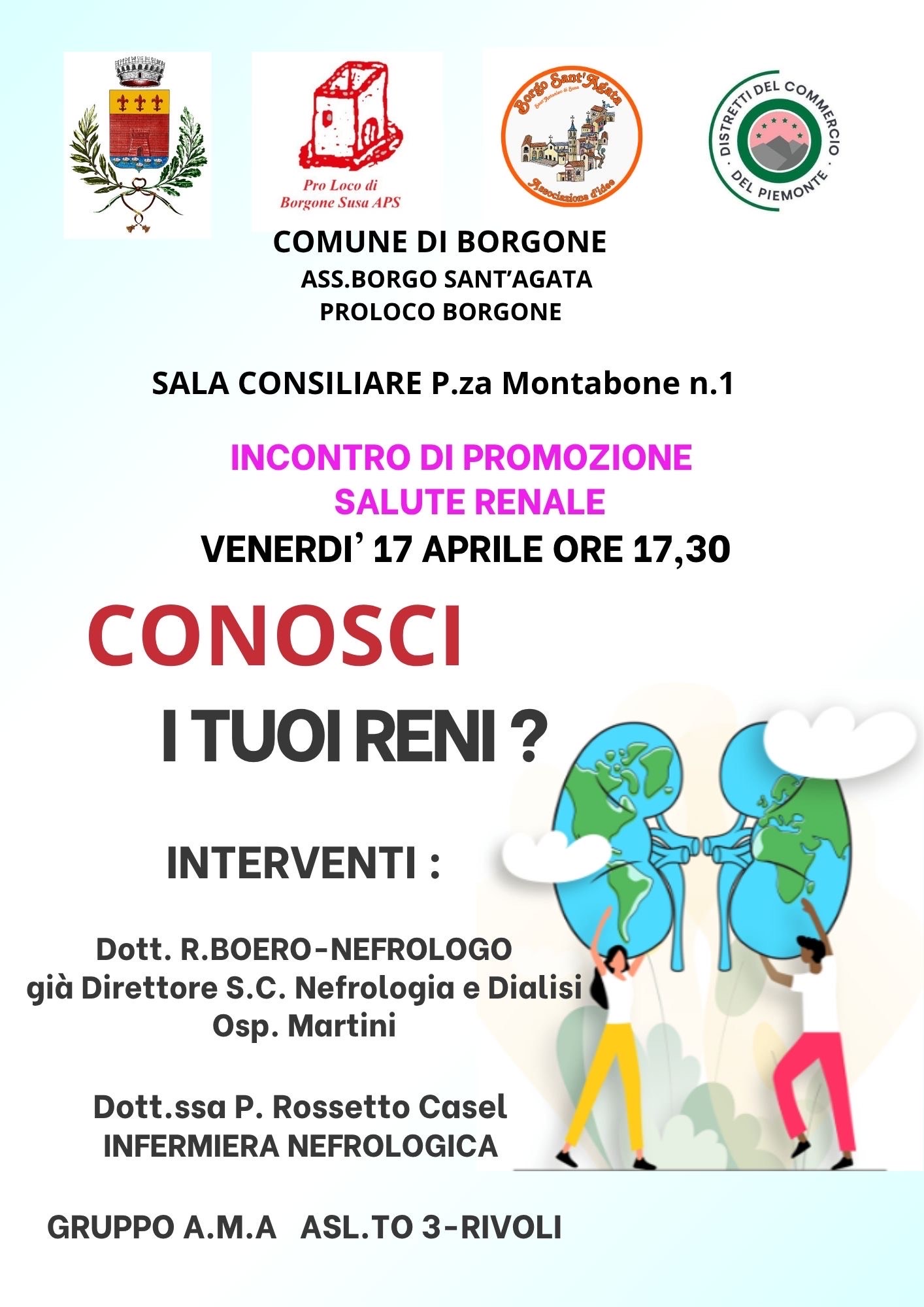 Venerdì 17 aprile alle ore 17:30, nella Sala Consiliare del Comune di Borgone di Susa, R.Boero - Nefrologo e P. Rossetto Casel - Infermiera Nefrologica terranno un incontro di promozione sulla salute renale.