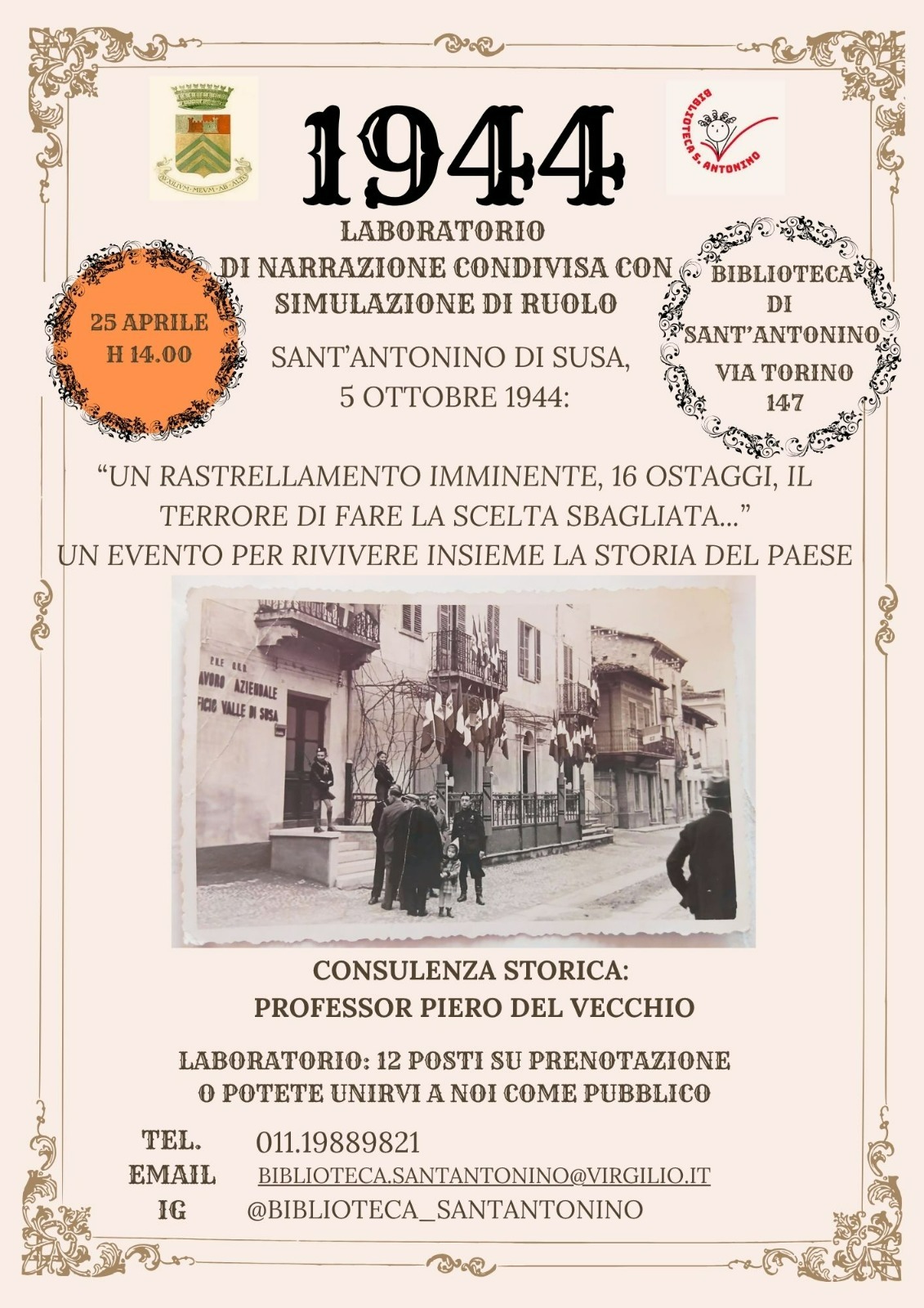 Sabato 25 aprile alla biblioteca di Sant'Antonino di Susa alle ore 14 "1944 – Laboratorio di narrazione condivisa con simulazione di ruolo".