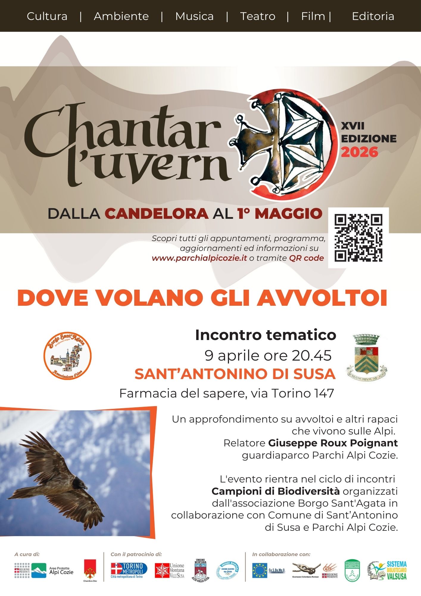 Giovedì 9 aprile alle ore 20.45 a Sant'Antonino di Susa, alla Farmacia del Sapere (via Torino 147), Dove volano gli avvoltoi, incontro di approfondimento su avvoltoi e altri rapaci che vivono sulle Alpi. Relatore Giuseppe Roux Poignant, guardiaparco Parchi Alpi Cozie.