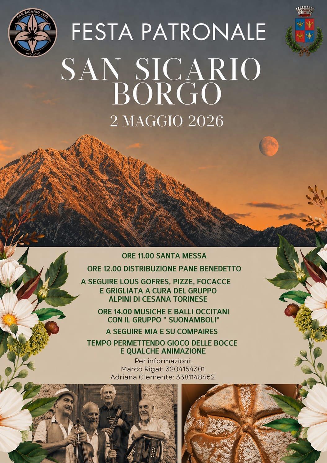 La Pro Loco San Sicario 1560 organizza i festeggiamenti per la Festa Patronale del Borgo di San Sicario: ore 11 Messa e a seguire distribuzione del pane benedetto, grigliata organizzata dal gruppo Alpini di Cesana, musica e balli occitani con il gruppo “I Suonamboli” e a seguire il gruppo “Mia e su compaires”.
