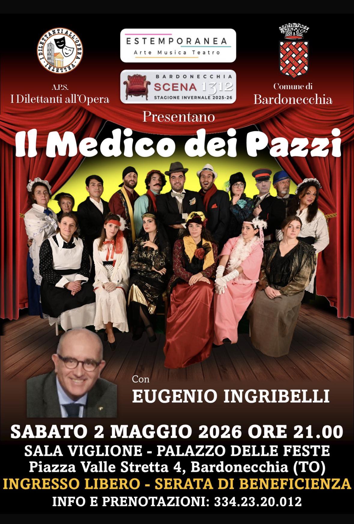 I Dilettanti all’Opera APS presentano il Il medico dei pazzi, celebre commedia di Eduardo Scarpetta proposta in un adattamento di Giuseppe Todaro e diretta dal giovane regista Gregory Specchi. La storia ruota attorno all’inganno di Ciccillo, studente di medicina pieno di debiti, che convince lo zio don Felice Sciosciammocca di essere direttore di un importante ospedale psichiatrico. In realtà si tratta di una pensione molto particolare, popolata da personaggi facilmente scambiabili per pazzi, dando vita a equivoci e colpi di scena esilaranti. L’appuntamento non sarà solo goliardico: la serata avrà anche una finalità benefica.