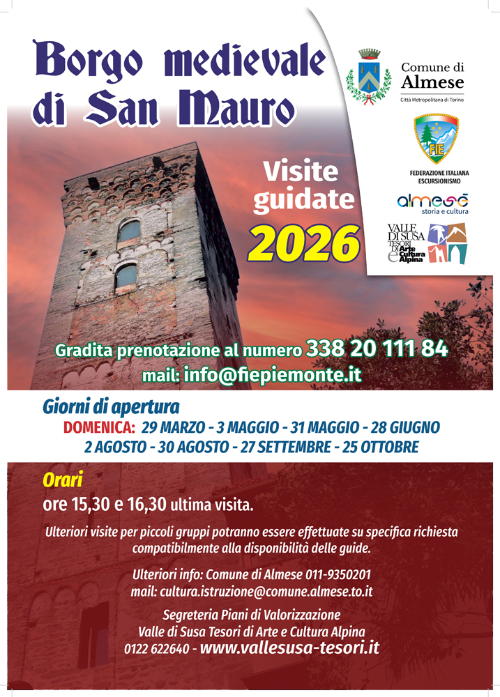 Visite guidate al Borgo Medievale di San Mauro ad Almese alle ore 15:30 e 16:30 nei giorni: domenica 29 marzo, 3 e 31 maggio, 28 giugno, 2 e 30 agosto, 27 settembre e 25 ottobre.